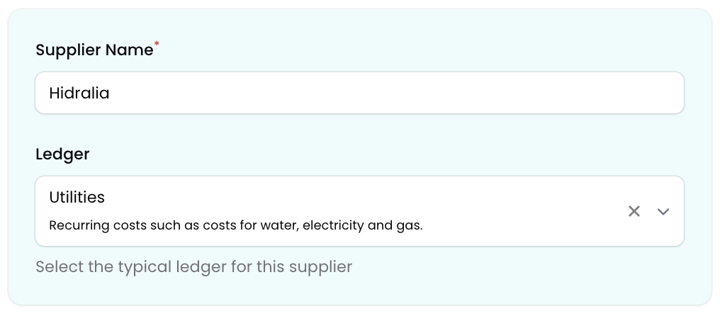 That’s why we introduced default ledgers. When adding a supplier, you can now select an appropriate ledger. See the example below, where the ledger Utilities is set for the supplier Hidralia.